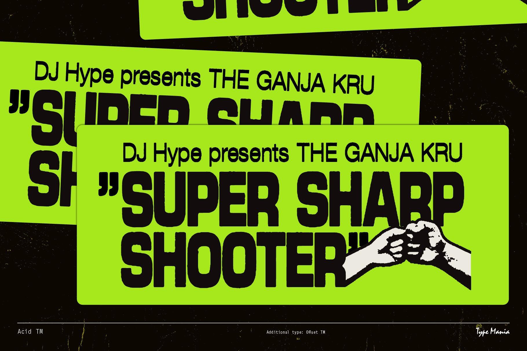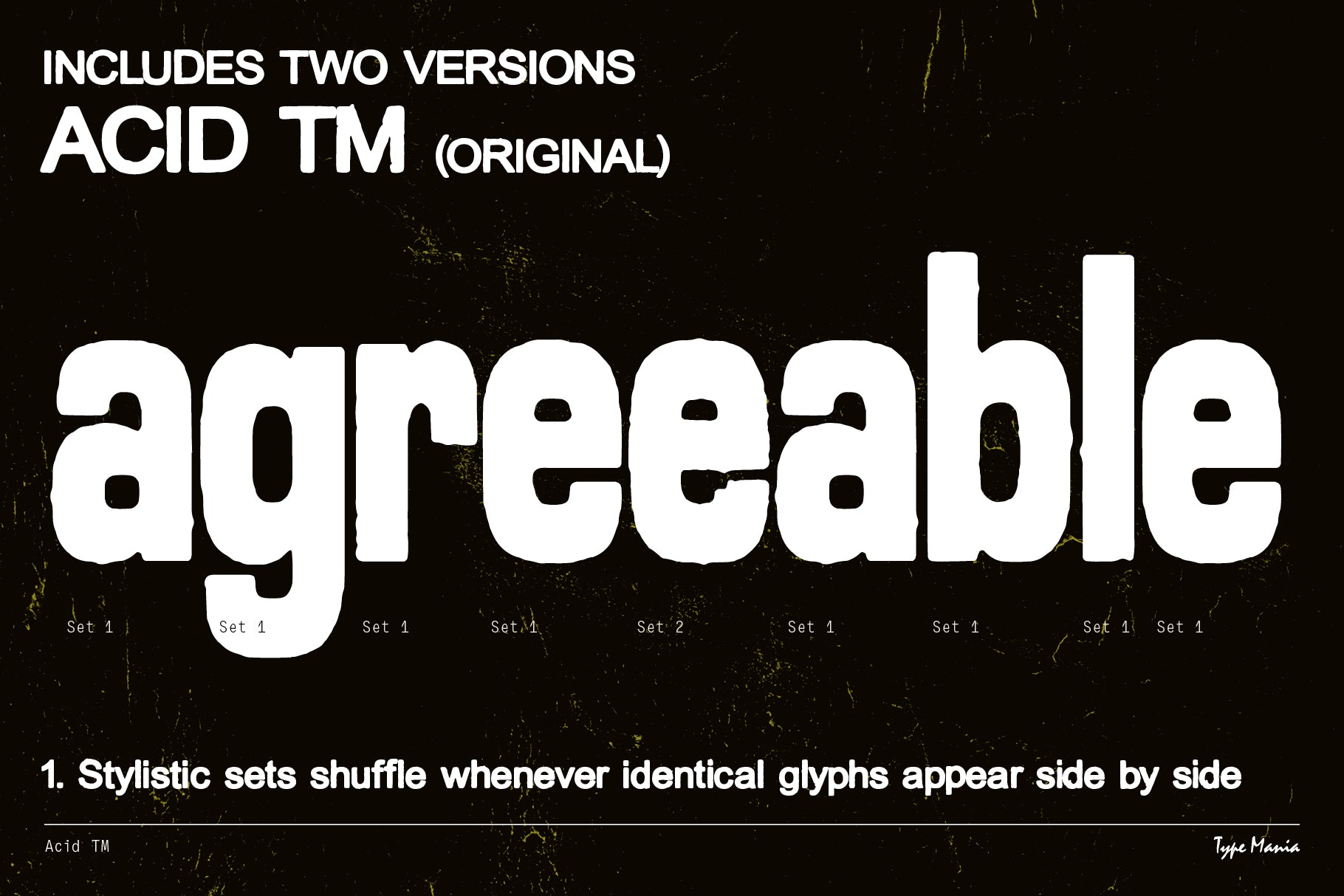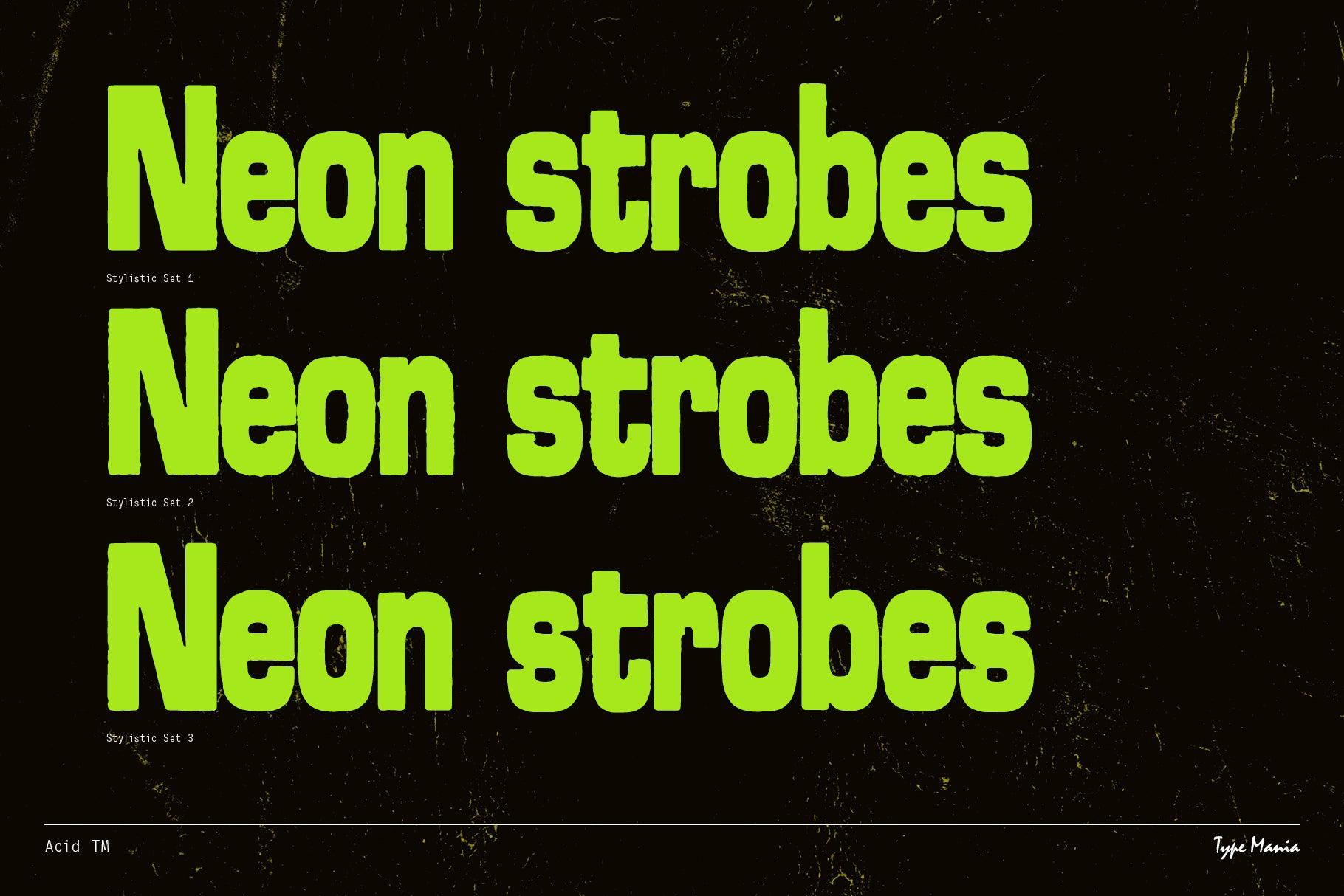 Acid TM is a rugged geometric sans serif. Perfect for your flyer, record cover or t-shirt design. It includes three stylistic sets of all the essential glyphs, which shift automatically to add character and texture.