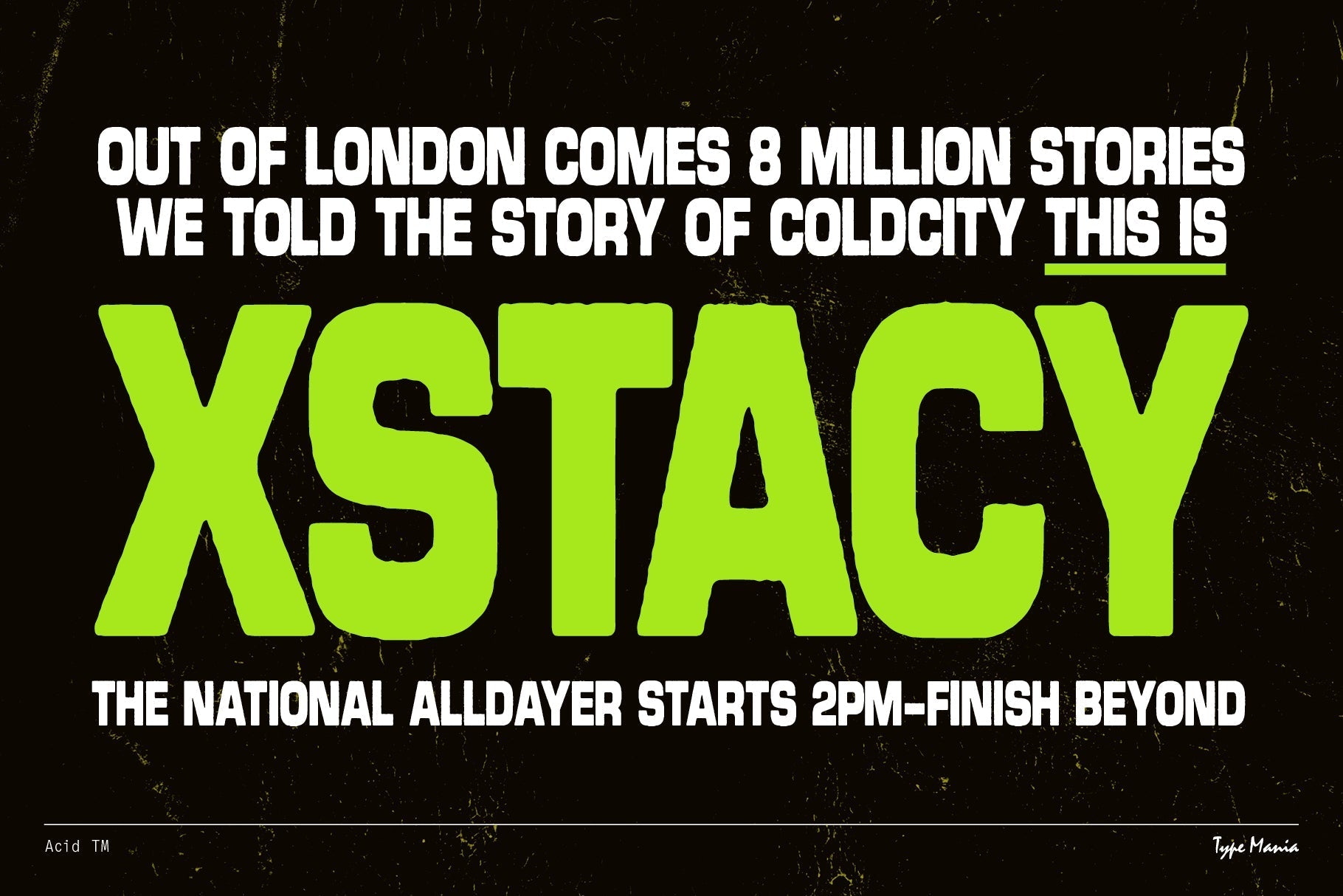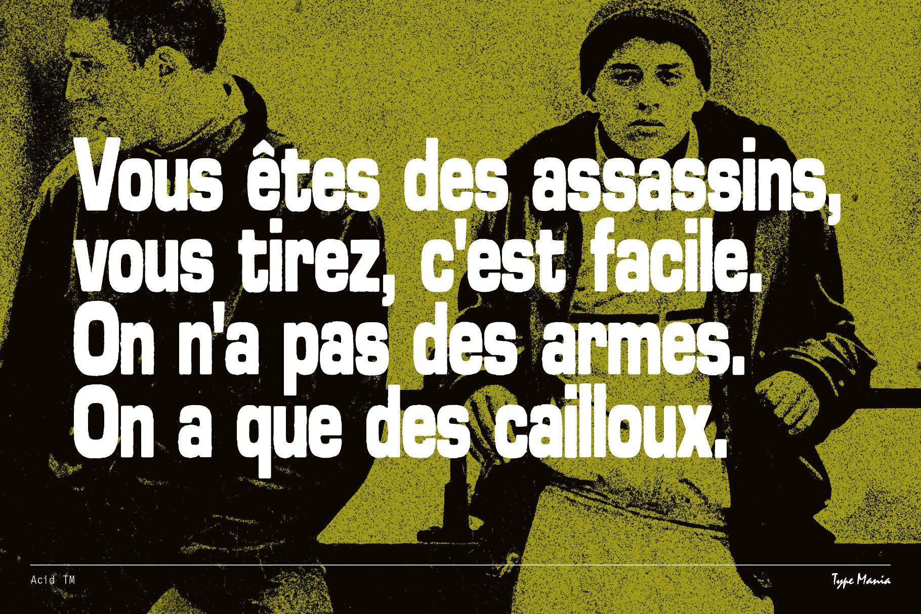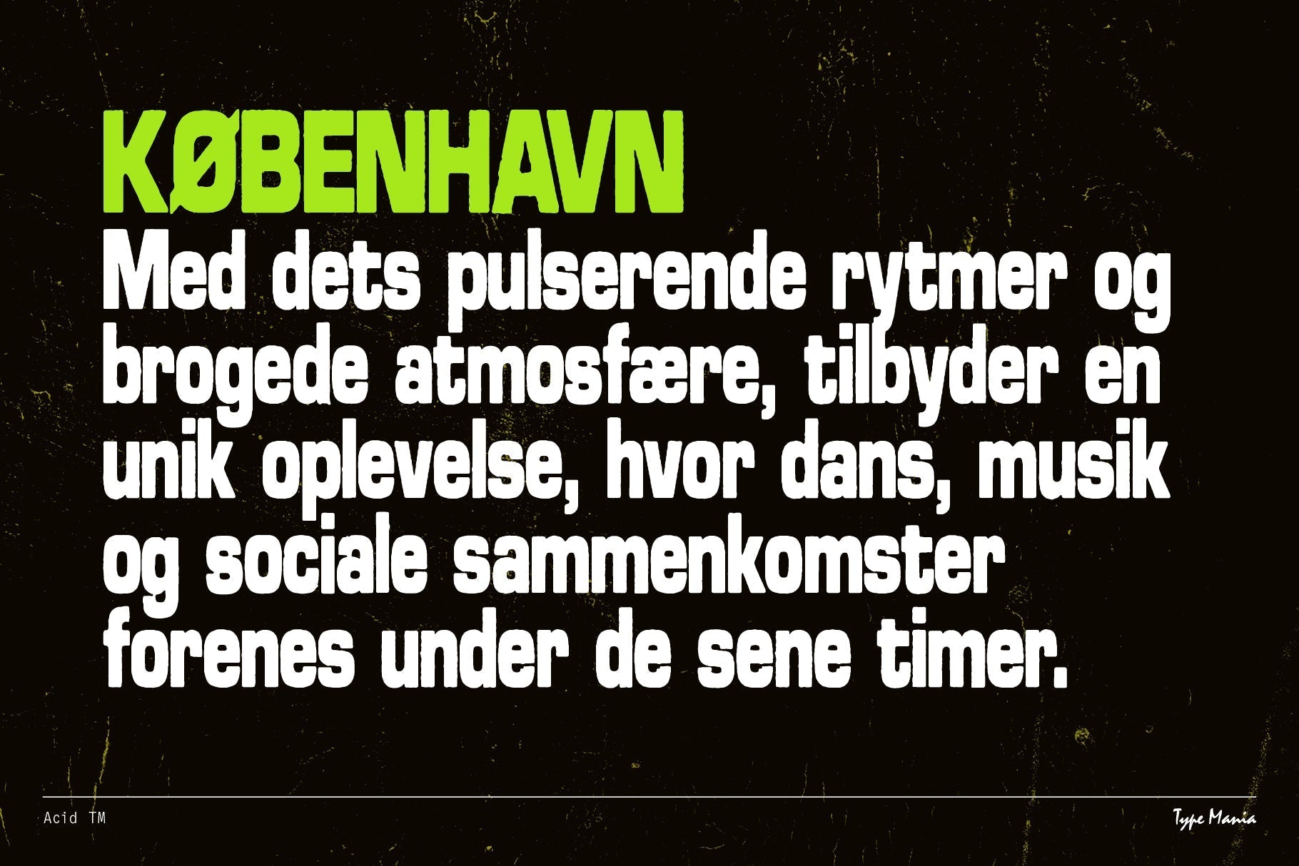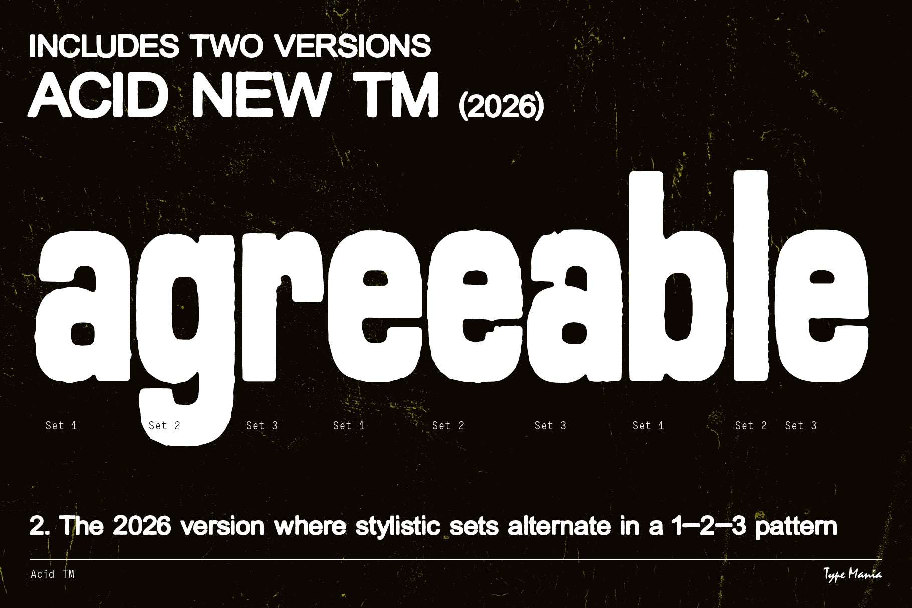 Acid TM is a rugged geometric sans serif. Perfect for your flyer, record cover or t-shirt design. It includes three stylistic sets of all the essential glyphs, which shift automatically to add character and texture.