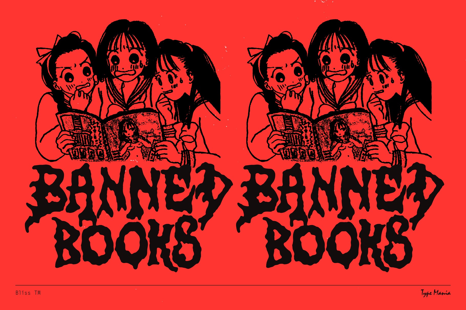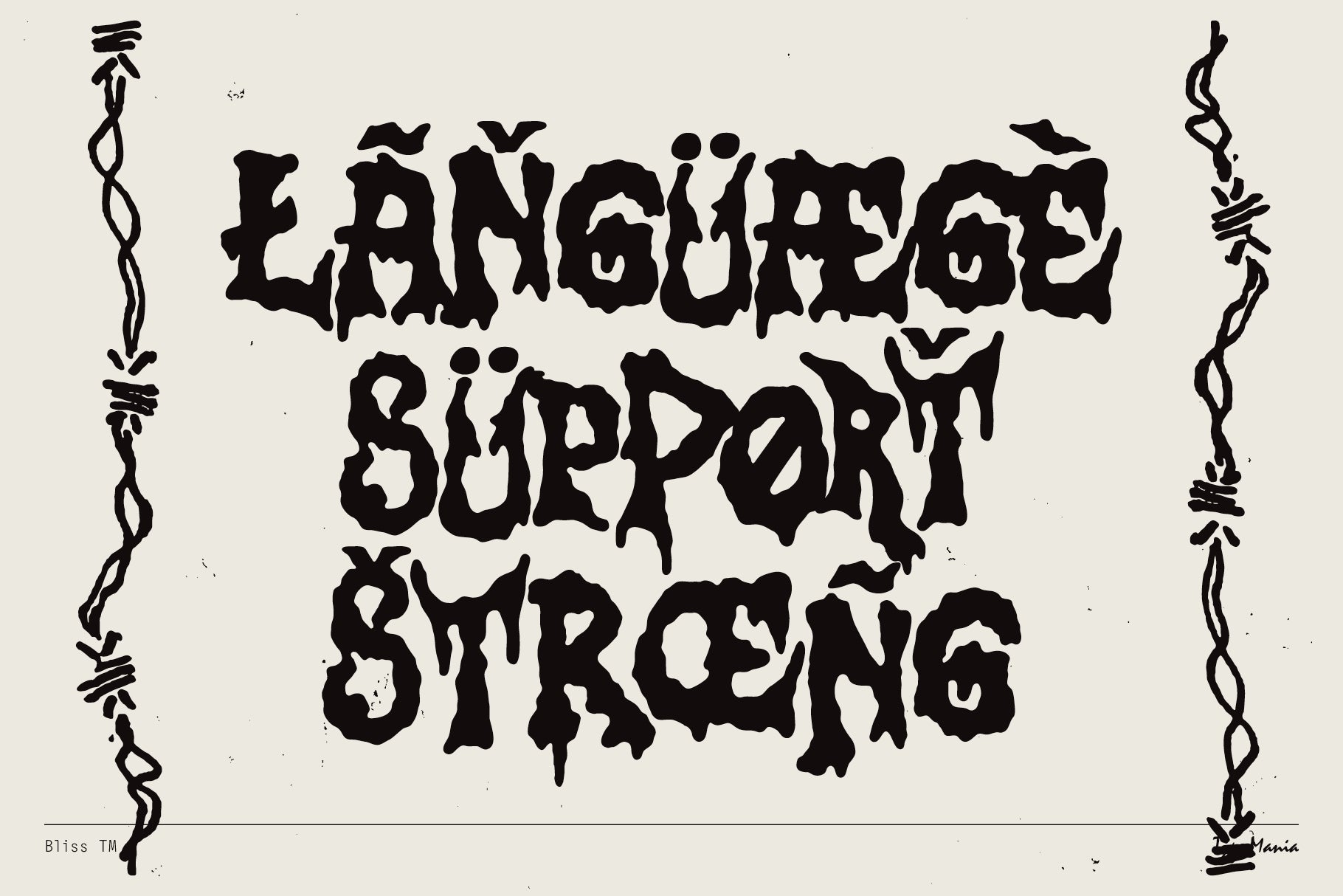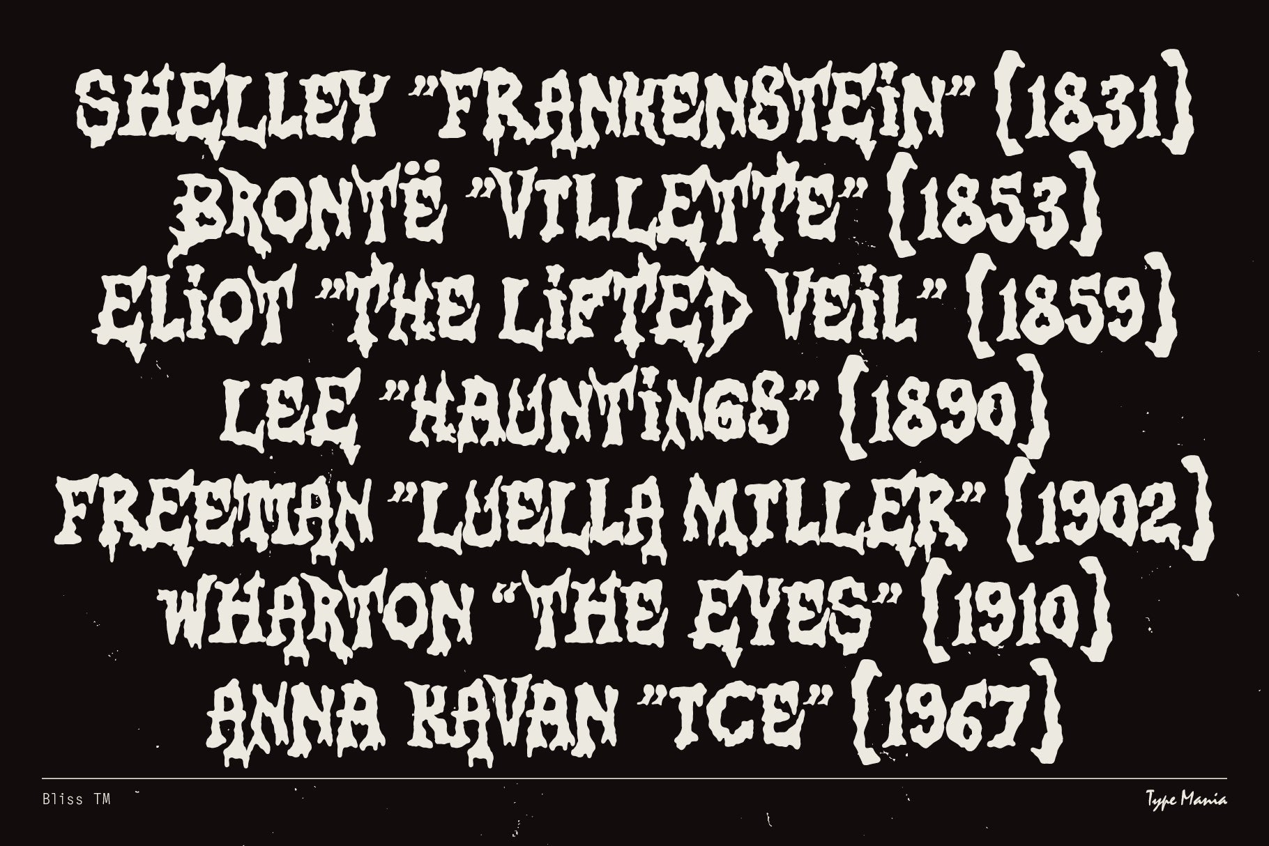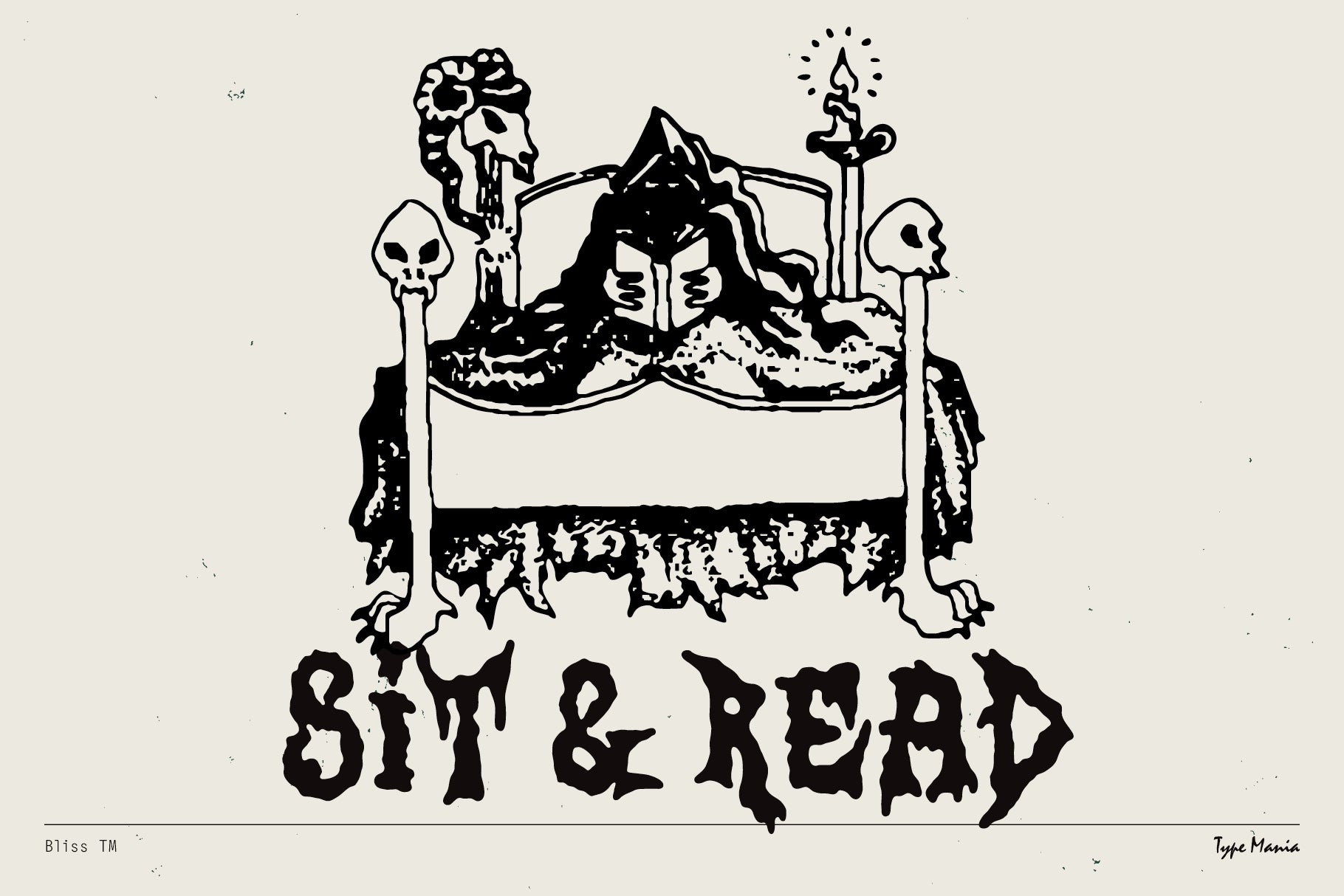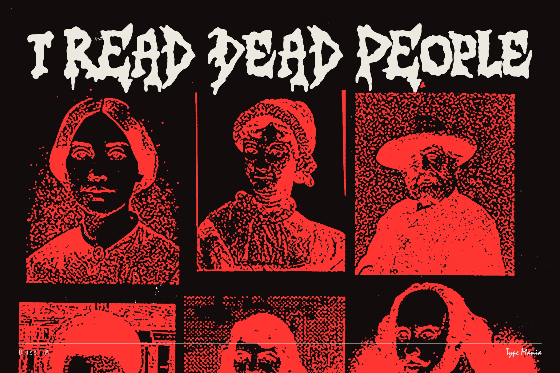 Bliss TM is a charming DIY vibes display font with one foot in the grave (the other in bootleg metal merchandise). Hand-cut, over-inked, intentionally imperfect – for Maximum Rocknroll. See if it works for your project, peace ✌️