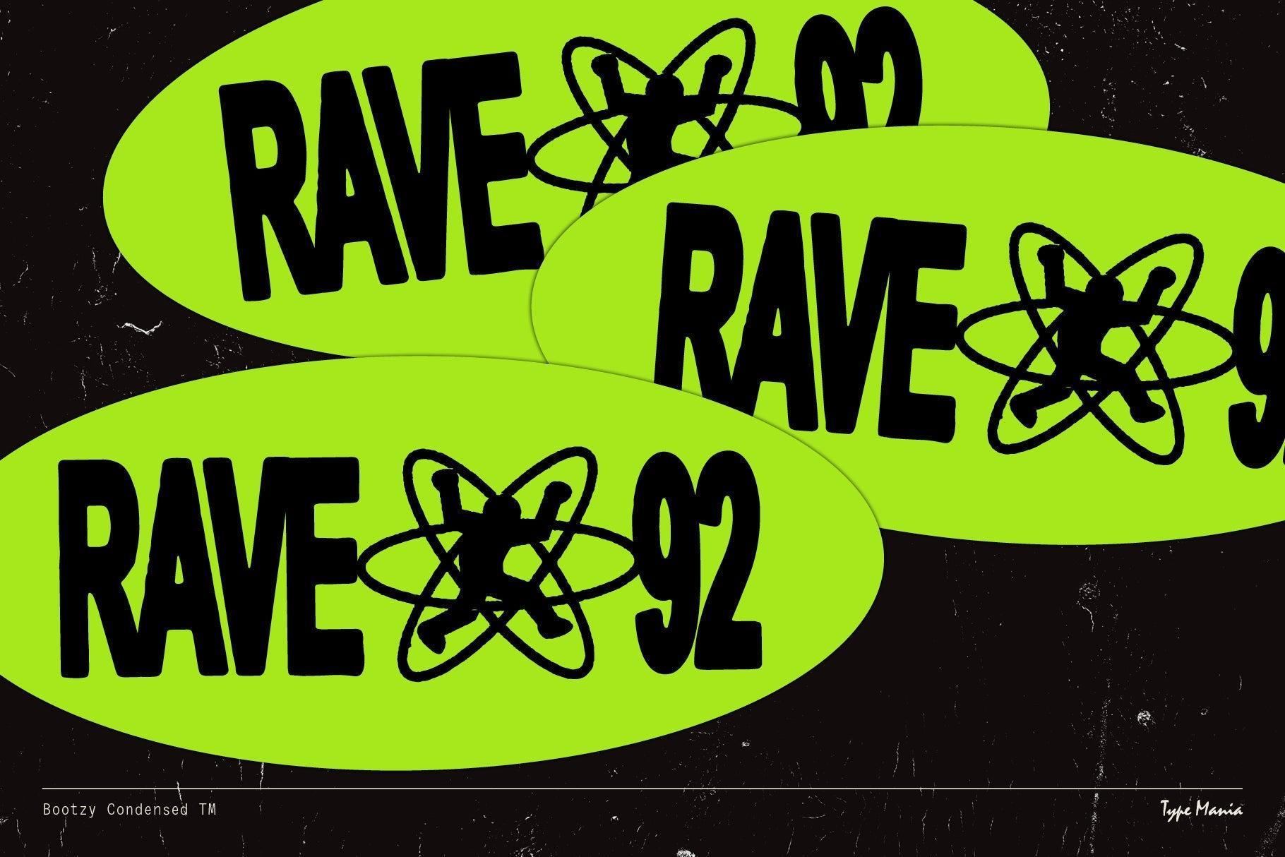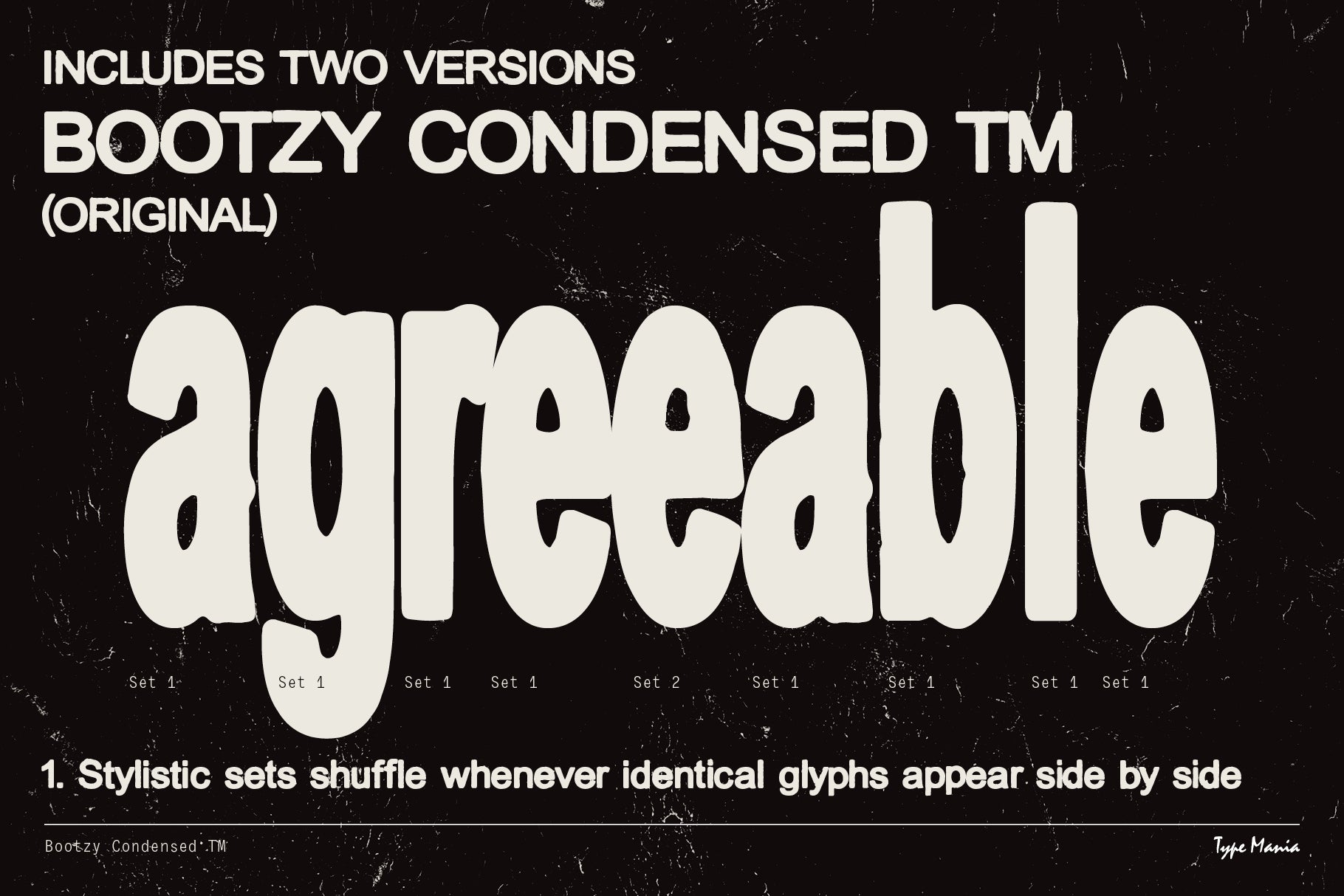 Introducing Bootzy Condensed TM, a rugged display sans serif born from and for the creative underground. Inspired by the DIY ethos of bootlegging, this font is perfect for flyers, zines, and rebellious expressions all over.