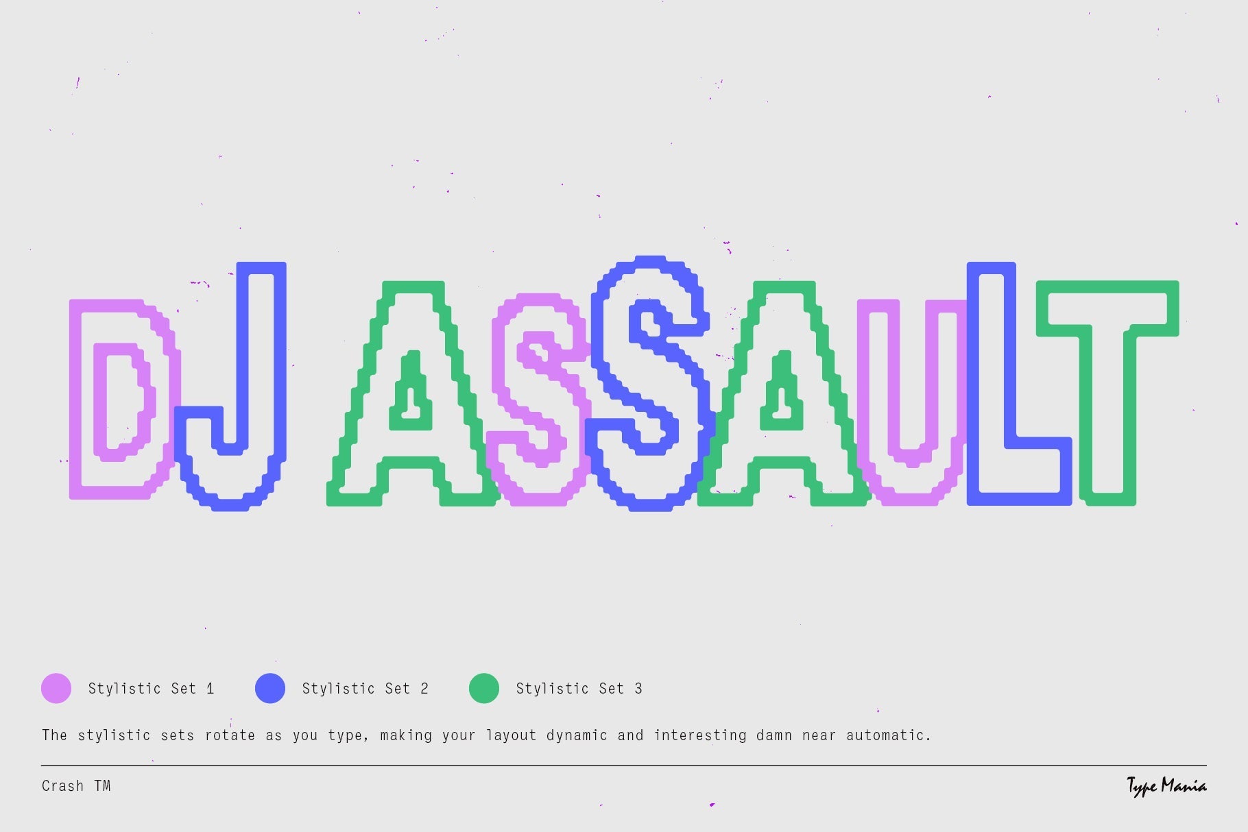 Crash TM – Elevate your projects with a rugged typeface that automatically rotates through three distinct stylistic sets in a 1-2-3 pattern, offering a fresh, robust look with every change 😮💨