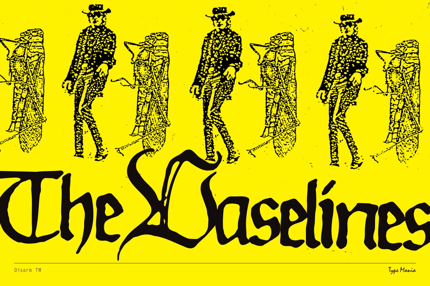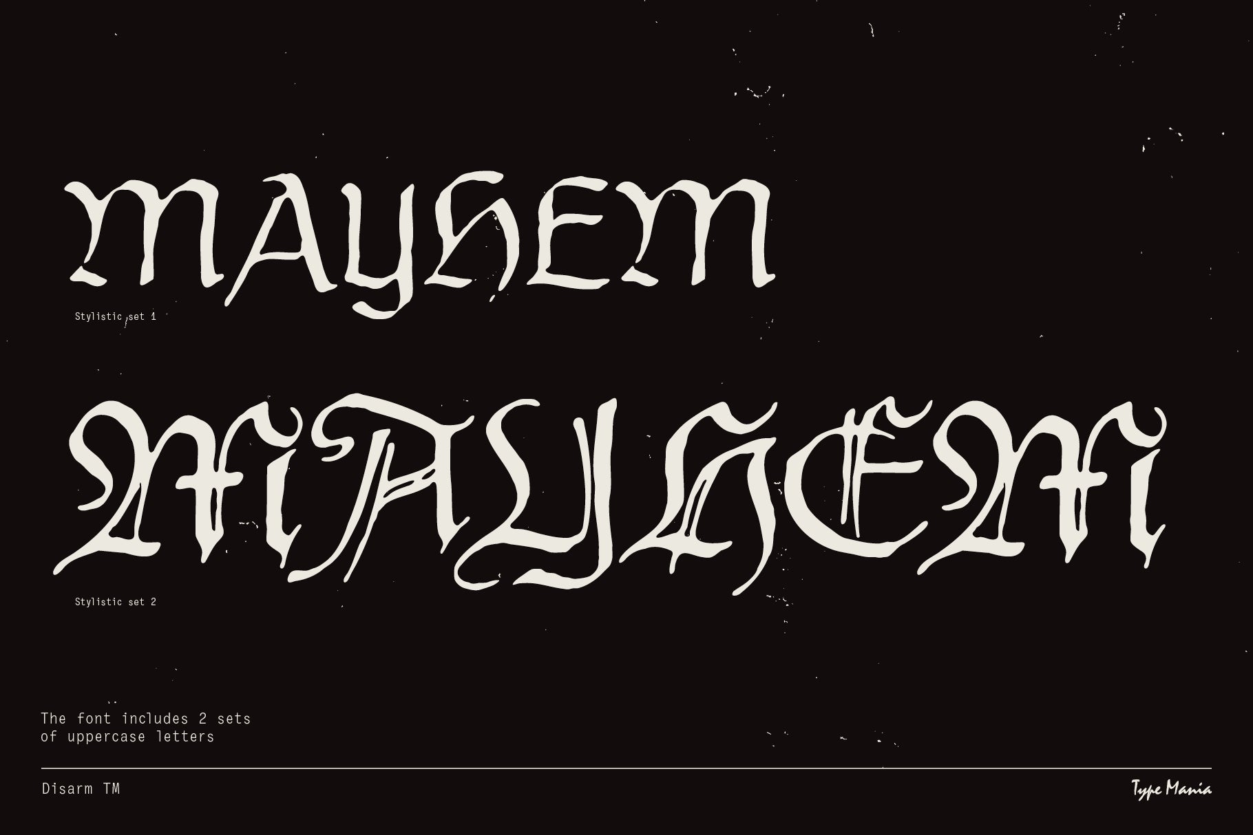 Disarm TM – a Fraktur with irregular rhythm and distressed details. Limited languages, but alternative capital letters on Stylistic Set 2 🤝