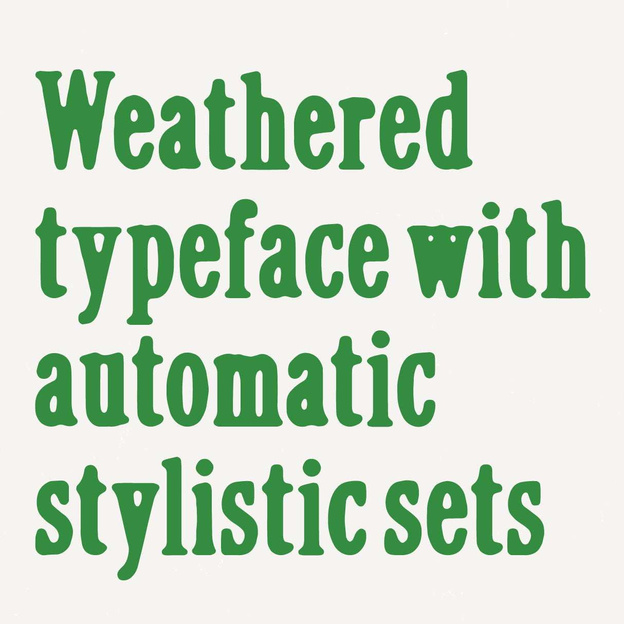 - Includes two versions of the font: 1. Stylistic sets shuffle whenever identical glyphs appear side by side, 2. A new version where stylistic sets alternate in a 1–2–3 pattern, when the Contextual Alternates is turned on.
