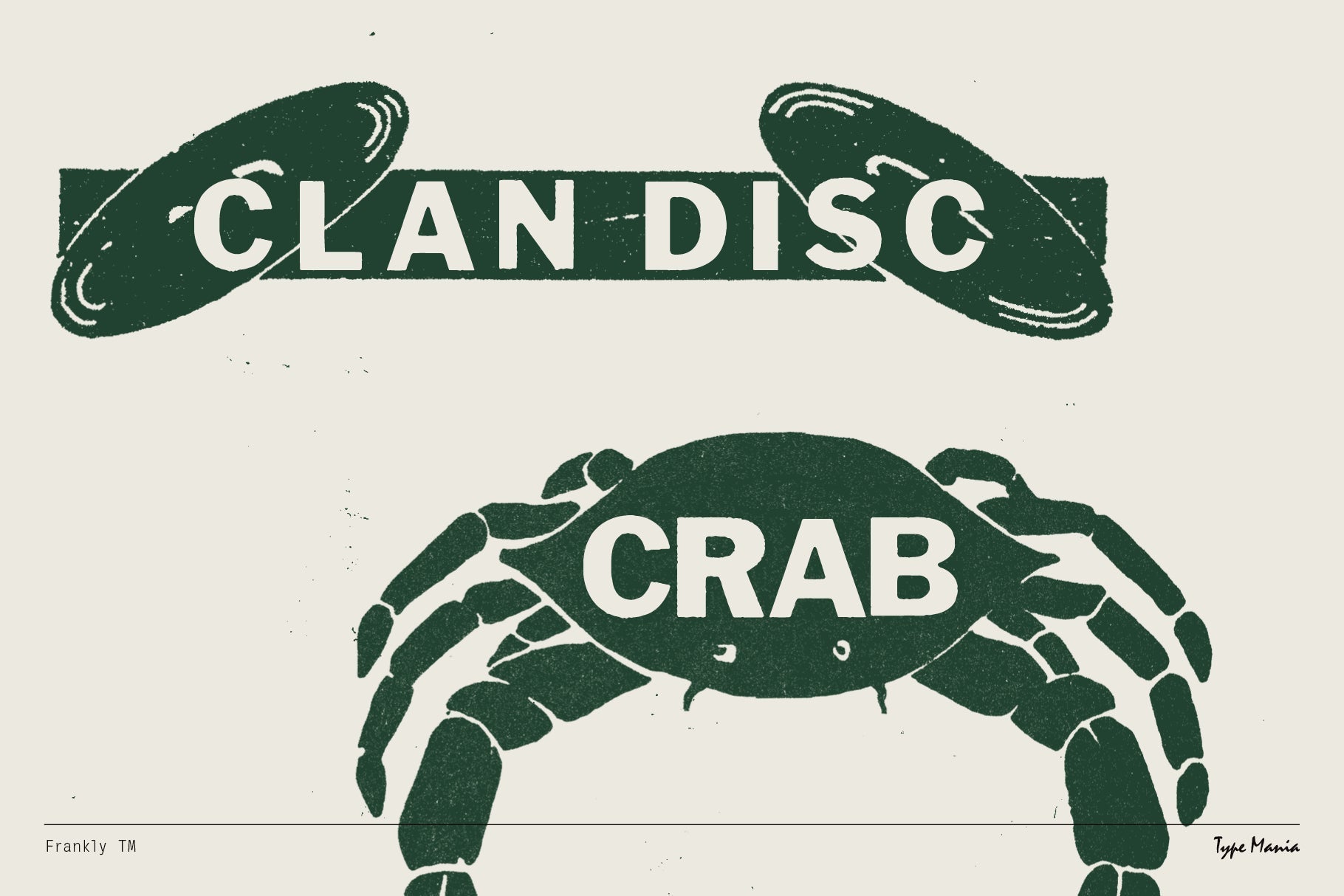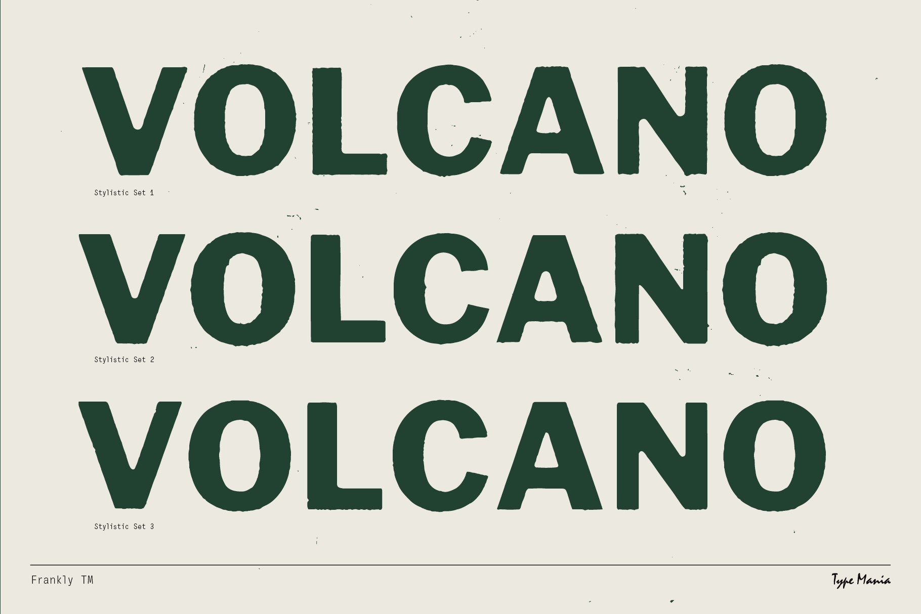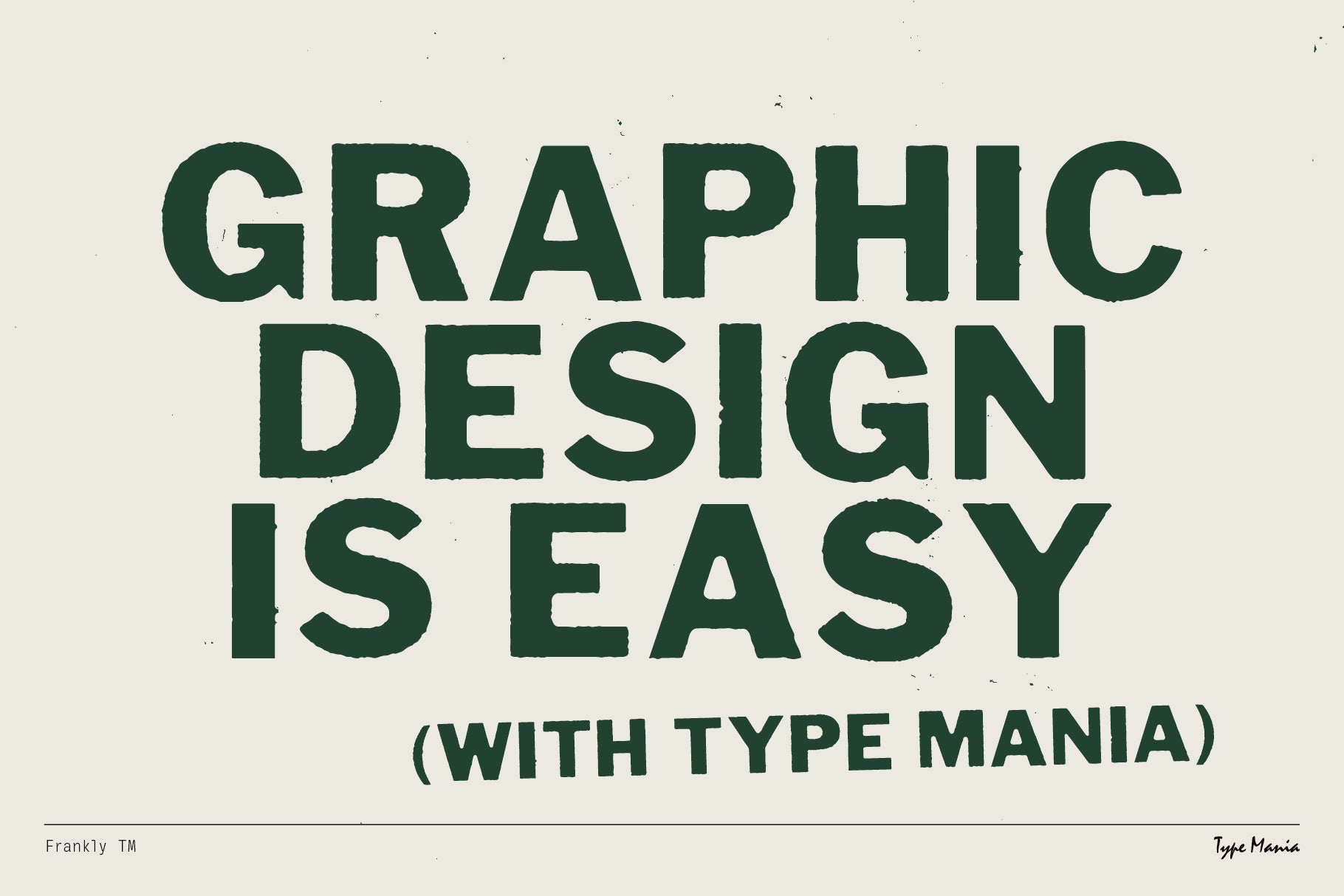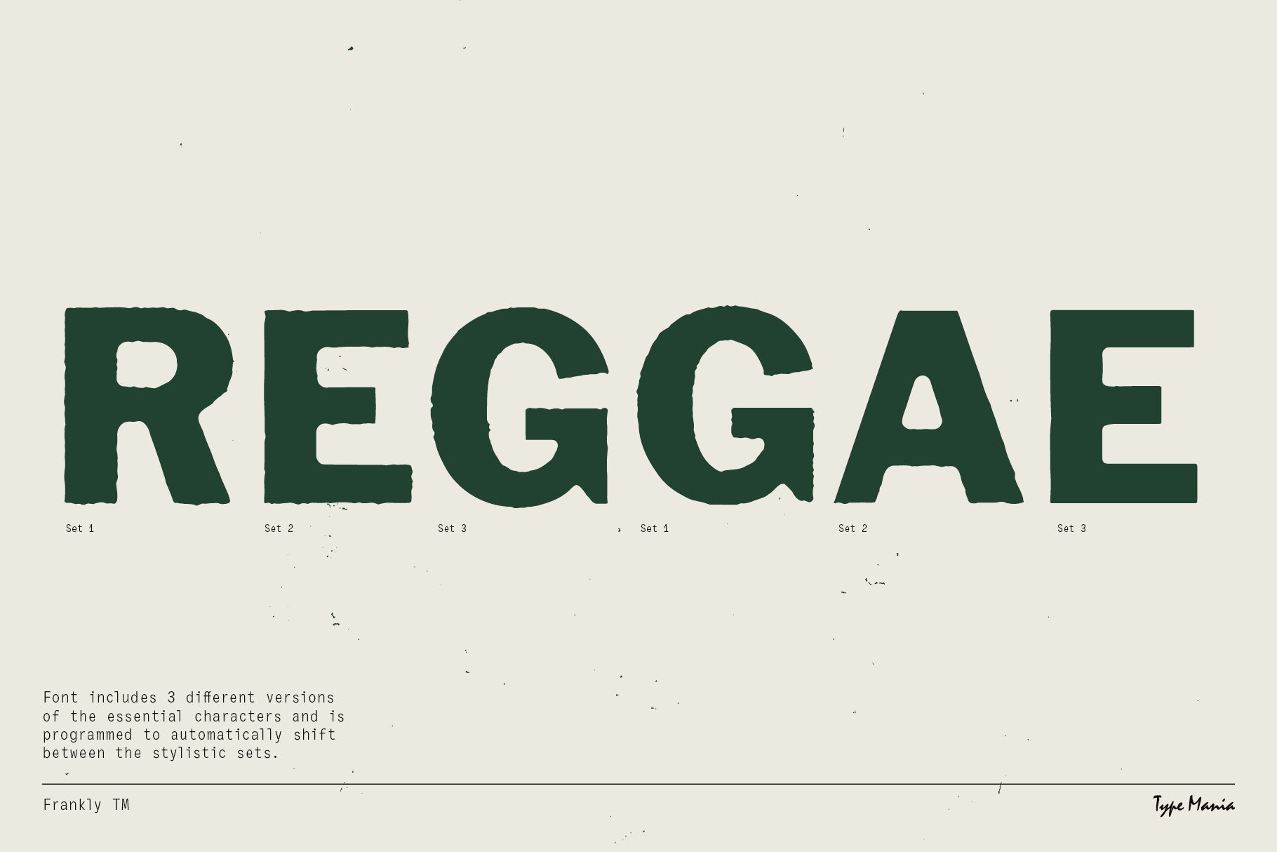 Frankly TM. With three stylistic sets rotating automatically (when contextual alternates are turned on), the typeface naturally mimics the subtle imperfections of misaligned offset printing. Perfect for headlines, packaging and branding (and reggae 45s), Frankly TM adds a raw, tactile quality to your designs.