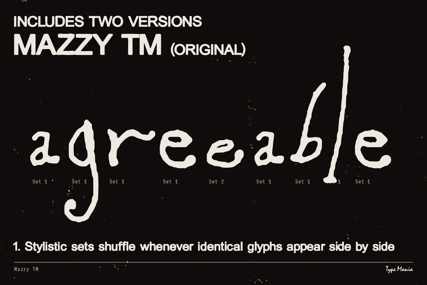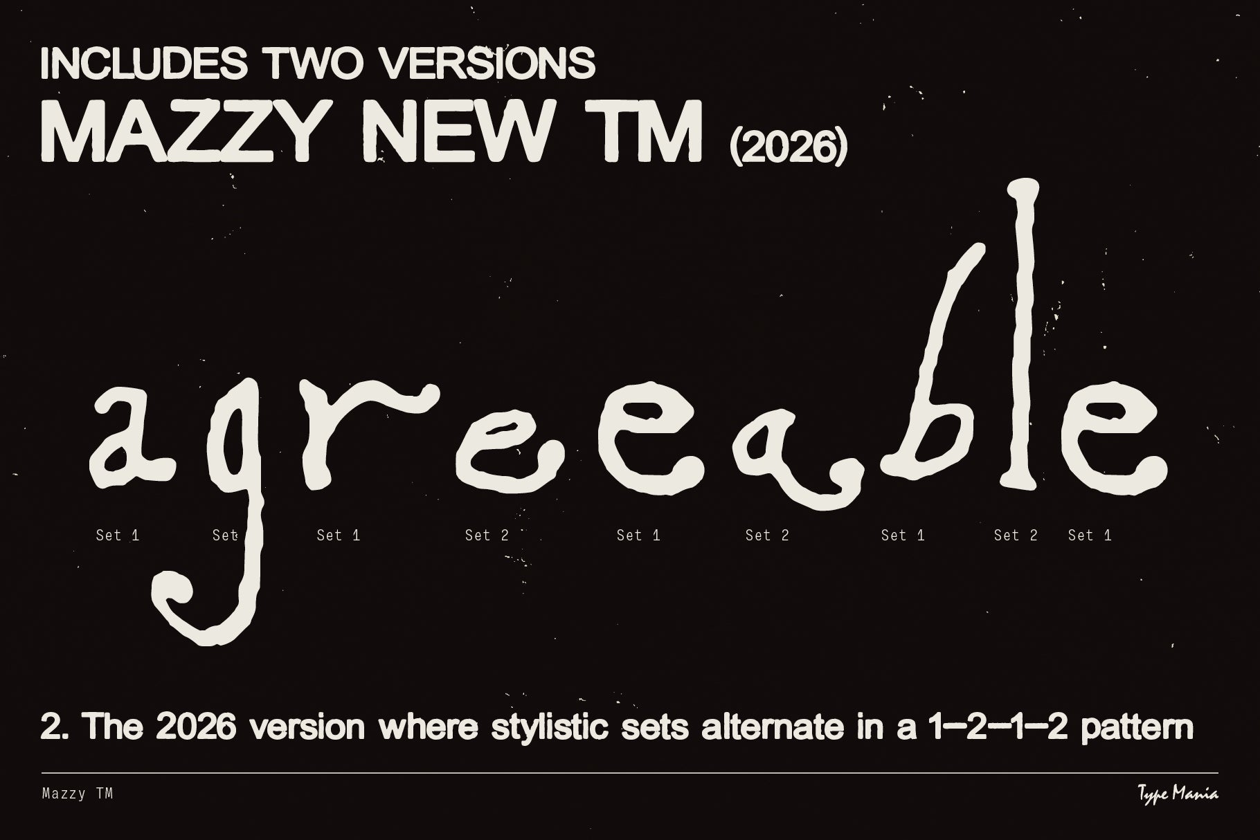 Meet Mazzy TM – the script channeling the underground spirit of the 80s and 90s alternative scene. Whether you're designing merchandise or event flyers, Mazzy TM is guaranteed to deliver.