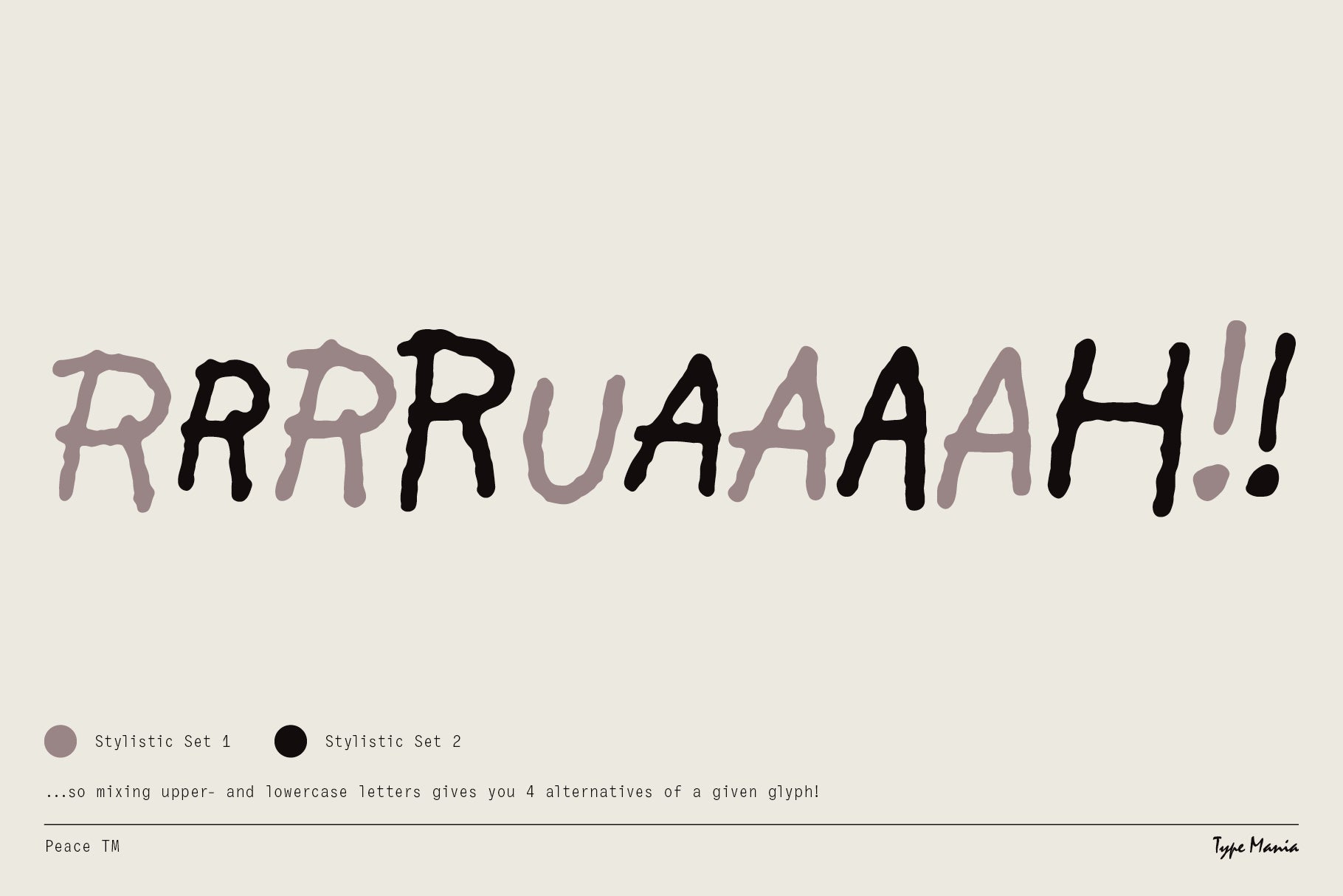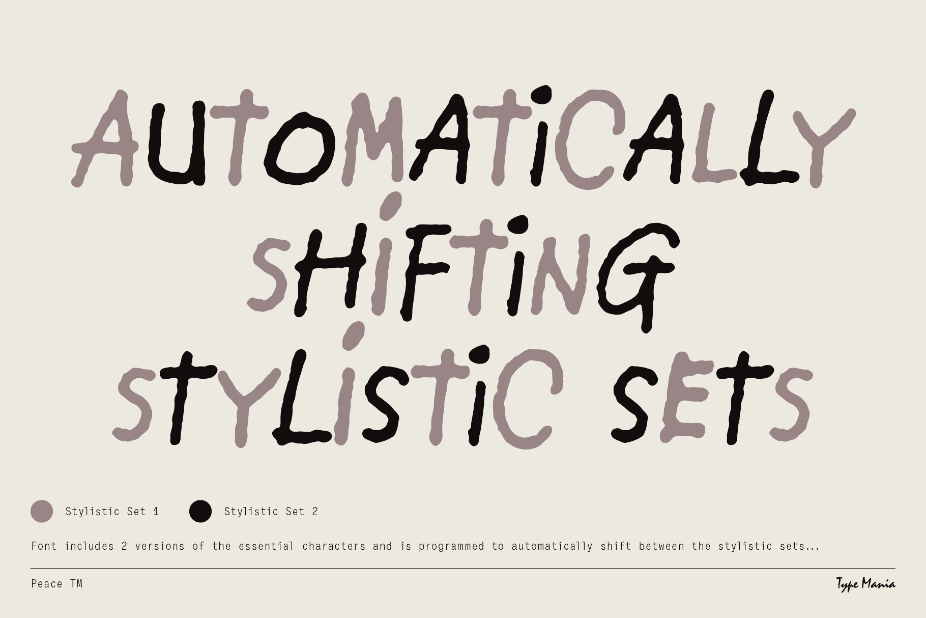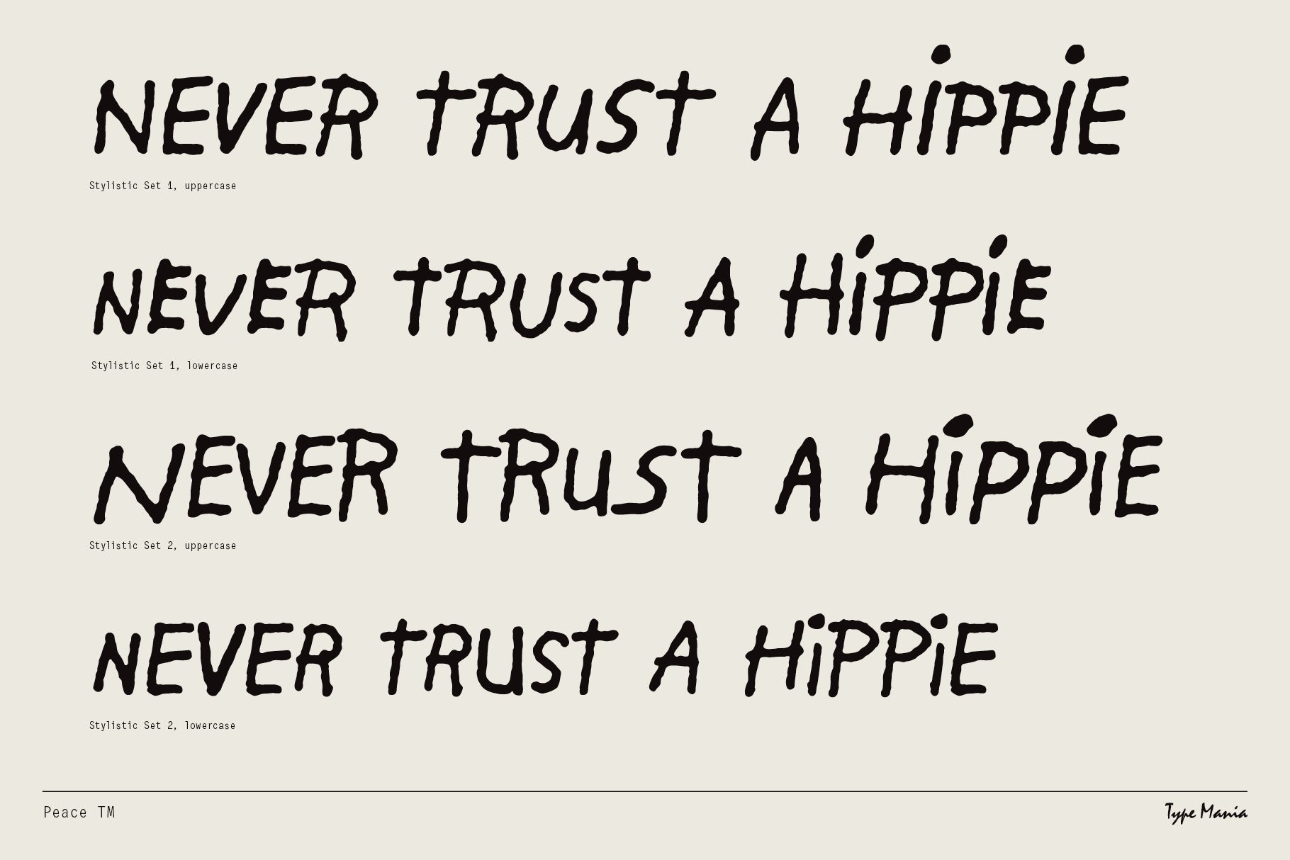 Capture the restless spirit of the 1960s with Peace TM, a handwritten typeface inspired by the underground comics of the era. The font is programmed to automatically shift between the stylistic sets, making your layouts dynamic and interesting damn near automatic... Good for graphic designers, artists, and period esthetes, Peace TM adds a nice touch any project 👌