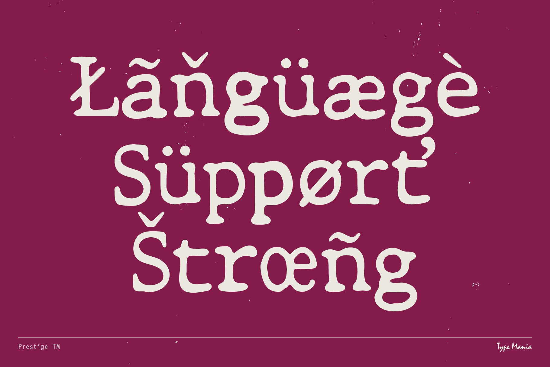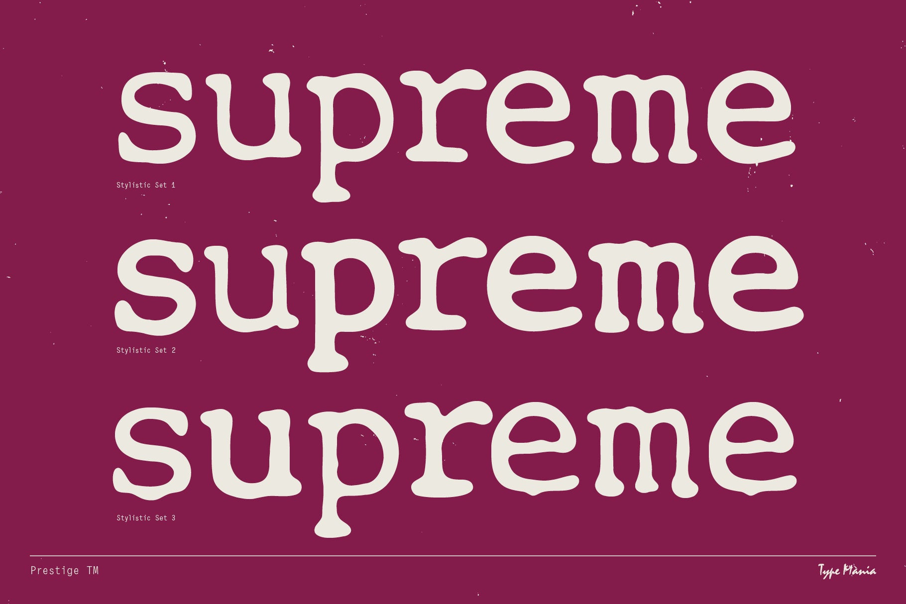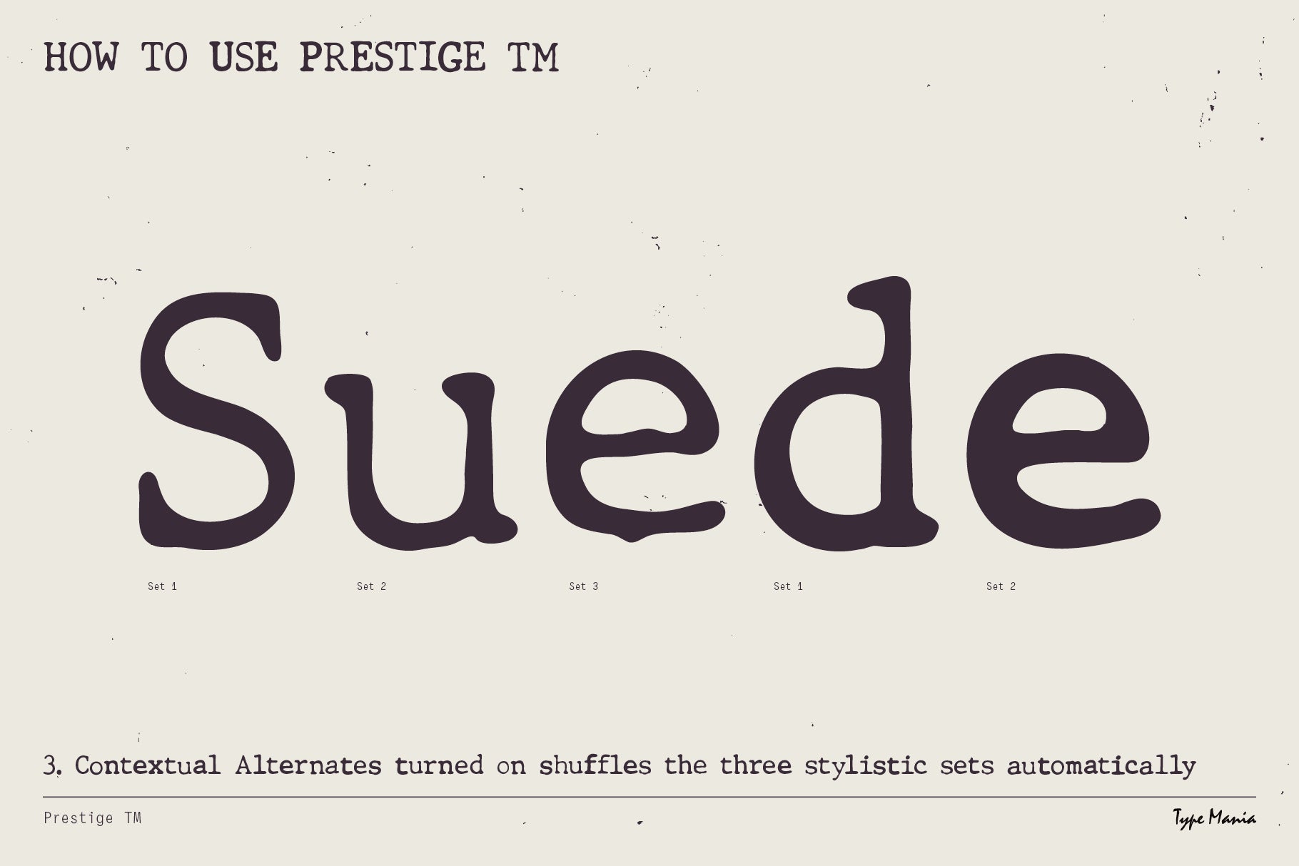 Prestige TM is a sans serif typeface rooted in mid-century typeball machines. It has distressed throwback shapes, but introduces a dynamic edge: its three stylistic sets rotate automatically, creating the same irregular vibe as ink striking paper.